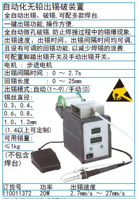 ·全自动出锡、破锡,可配多款焊台. ·一键出锡功能,操作方便. ·全自动微孔破锡,防止焊接过程中的锡爆现象. ·出锡速度、出锡时间、出锡间隔时间均可调,且设有可调的回锡功能,以减少焊锡的浪费. ·可配置脚踏出锡开关及手动出锡开关。
