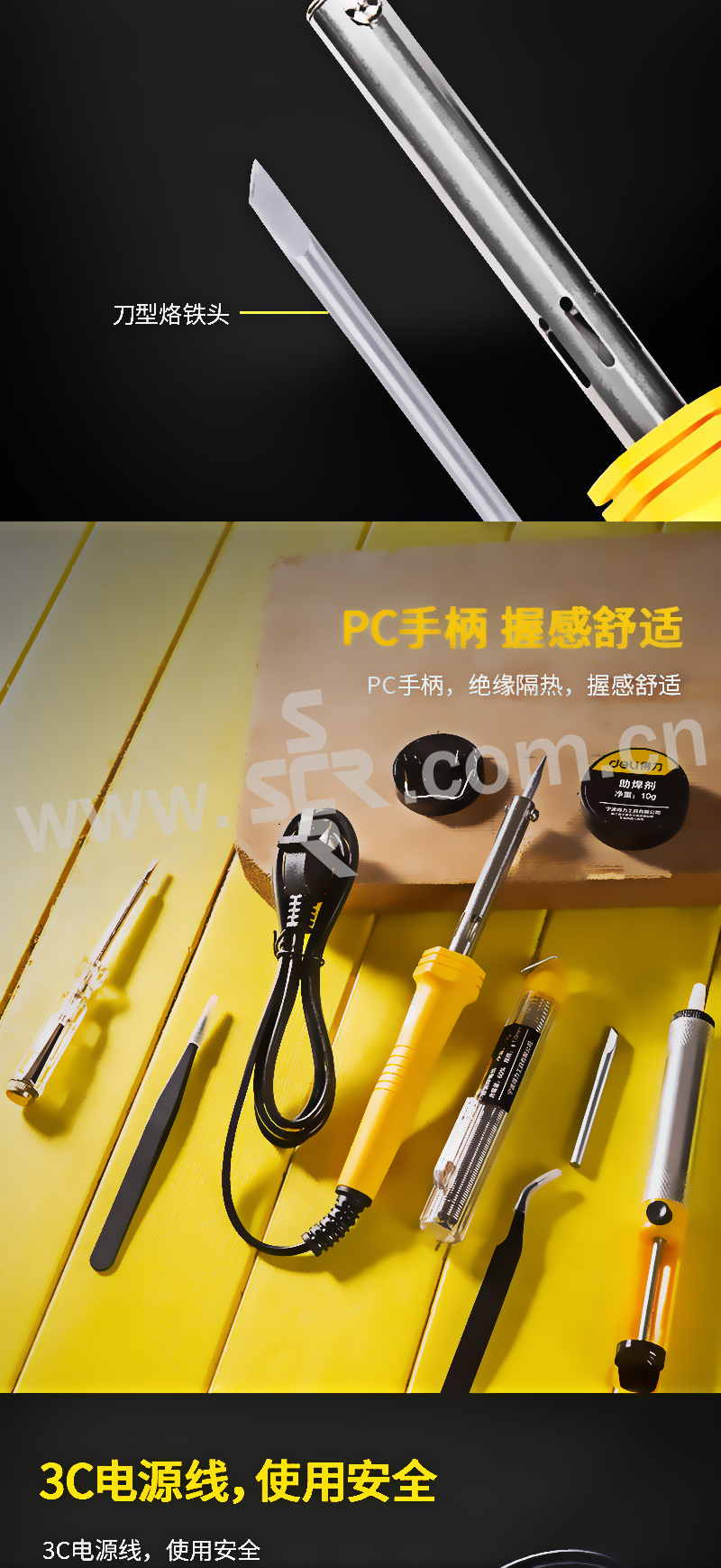 ·双层天然云母发热芯,快速传热,可简易更换设计发热芯设计,合金电镀紫铜烙铁头,加厚镀层,抗腐蚀,不锈钢外壳设计,国标3C电源线