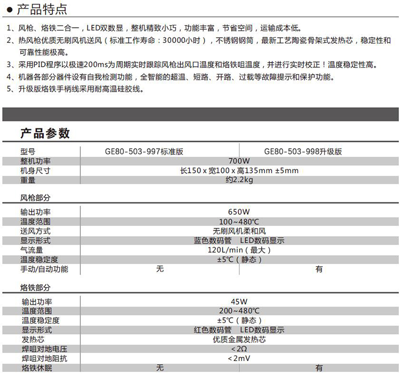 ·风枪、烙铁二合一,LED双数显,整机精致小巧,功能丰富,节省空间,运输成本低。
