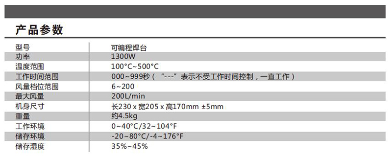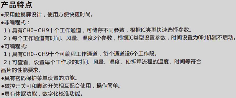 ·采用触摸屏设计,使用方便快捷时尚。 ·非编程式∶ 1)具有CHO~CH9十个工作通道,可储存不同参数,根据IC类型快速选择参数。 2)每个工作通道有时间、风量、温度3个参数,根据IC类型设置参数,时间设置为0时机器不启动。 ·可编程式: 1)具有CH0~CH9十个可编程工作通道,每个通道设6个工作段。 2)可查看、设置每个工作段的时间、风量、温度、使拆焊流程的温度、时间等符合晶片的性能要求。 ·具有密码保护菜单设置的功能。 ·磁控开关可和脚踏开关相互配合使用,操作简单。 ·具有休眠功能,数字化校准功能。