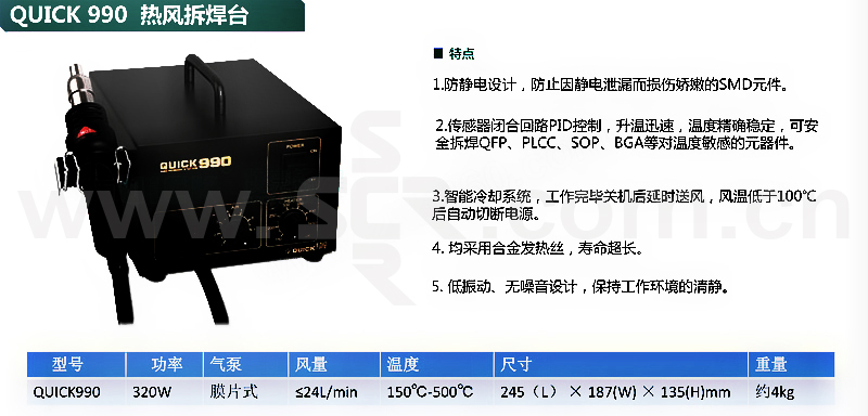 QUICK/快克 热风拆焊台 QUICK990 功率320w 风量≤24L/min 温度150—500℃ 1台