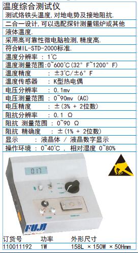 ·测试烙铁头温度,对地电势及接地阻抗. ·二合一设计,可以选配探针测量锡炉或其他液体温度. ·采用高可靠性微电脑检测,精度高.