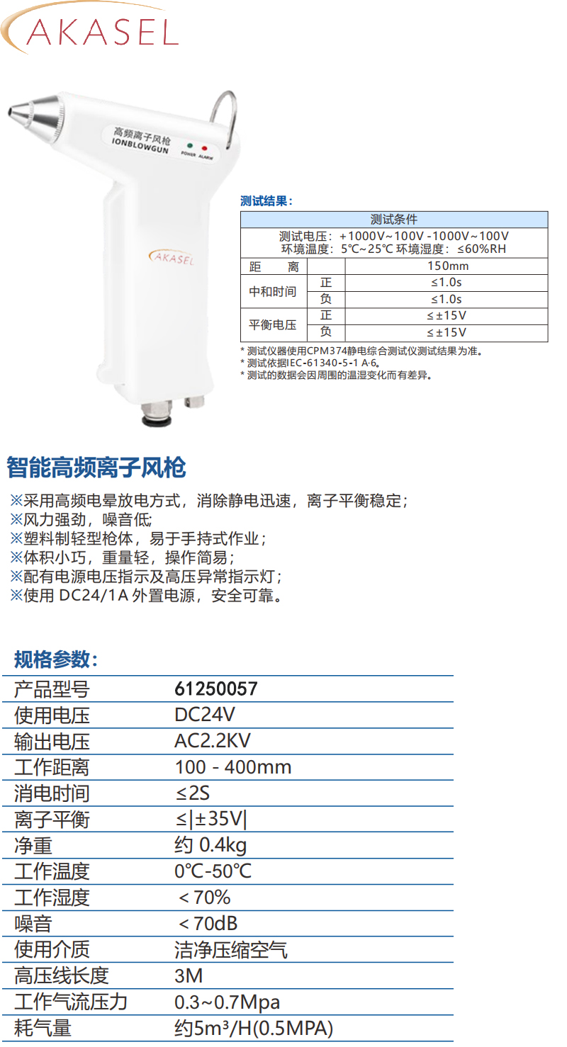 ·采用高频电晕放电方式,消除静电迅速,离子平衡稳定; ·风力强劲,噪音低; ·塑料制轻型枪体,易于手持式作业; ·体积小巧,重量轻,操作简易; ·配有电源电压指示及高压异常指示灯; ·使用 DC24/1A 外置电源,安全可靠。