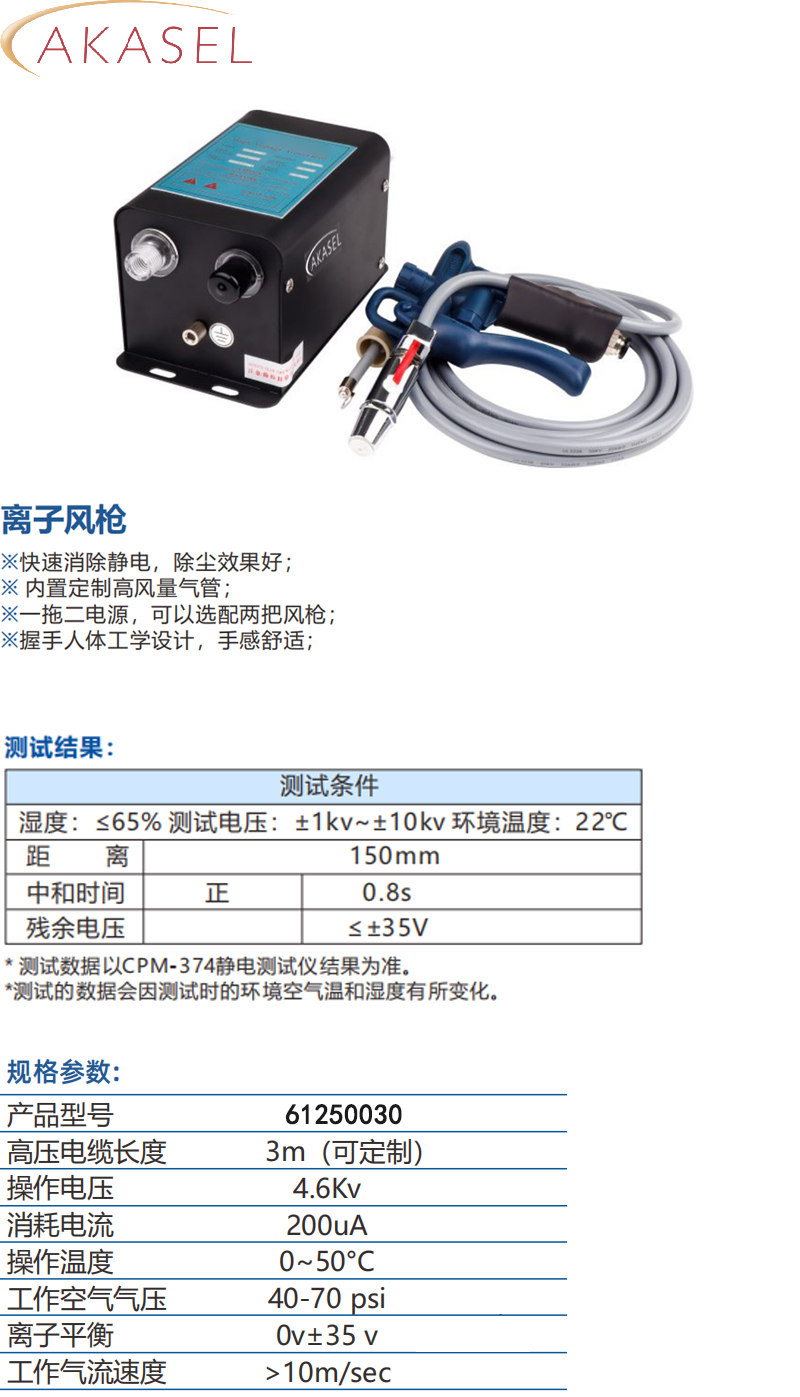 ·快速消除静电,除尘效果好; ·内置定制高风量气管; ·一拖二电源,可以选配两把风枪; ·握手人体工学设计,手感舒适; ※离子针和出风口风电隔离,灌胶处理,寿命耐久。