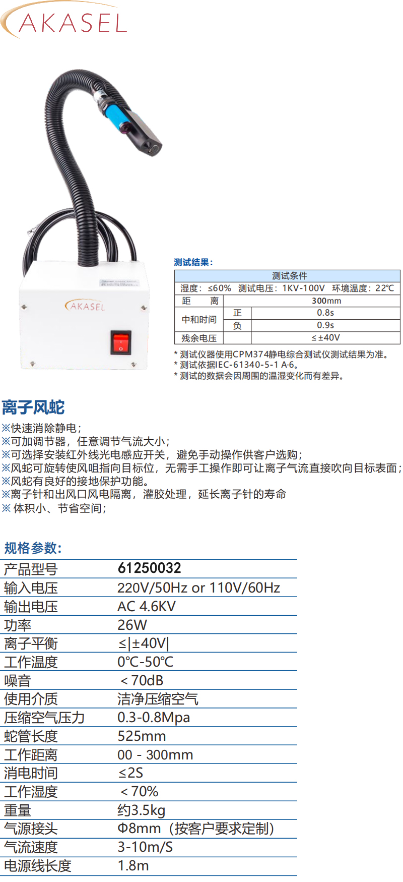 ·快速消除静电; · 体积小、节省空间; ·可加调节器,任意调节气流大小; ·可选择安装红外线光电感应开关,避免手动操作供客户选购; ·风蛇可旋转使风咀指向目标位,无需手工操作即可让离子气流直接吹向目标表面; ·风蛇有良好的接地保护功能。