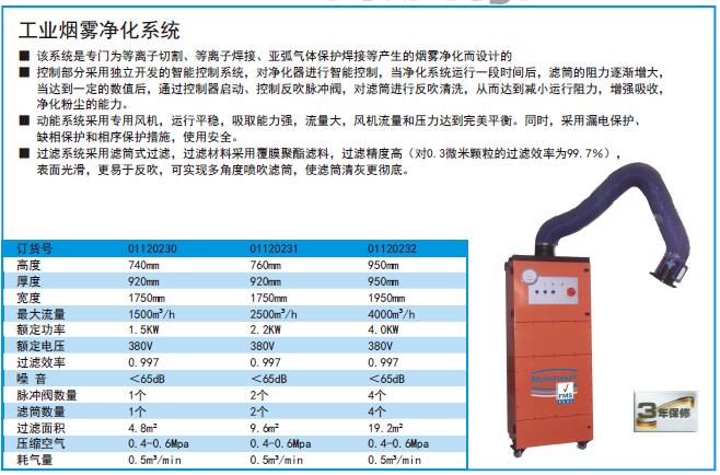 F32847 01120232 等离子切割、等离子焊接、亚弧气体保护焊接等产生的烟雾净化 滤筒式过滤 950mm 950mm 4.0KW 380V 0.997 <65dB 4个 19.2m² 0.4-0.6Mpa 0.5m³/min 37745.00