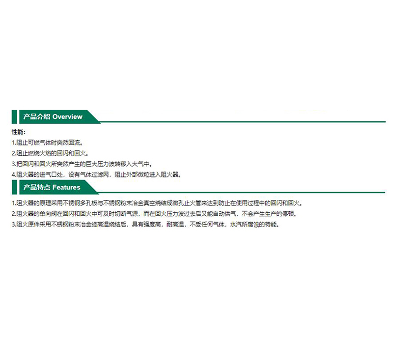 ·2.阻火器的单向阀在回闪和回火中可及时切断气源,而在回火压力波过去后又能自动供气,不会产生生产的停顿。