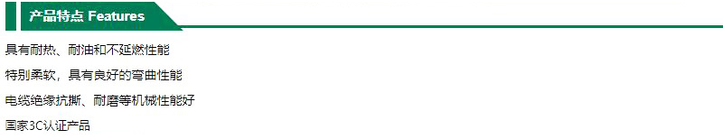 ·具有耐热、耐油和不延燃性能 ·特别柔软,具有良好的弯曲性能 ·电缆绝缘抗撕、耐磨等机械性能好 ·国家5C认证产品