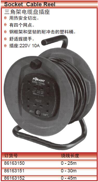 ·三角架电缆盘插座用热安全切出。 ·有四个网点。 ·钢框架和坚韧的耐冲击的塑料桶。 ·舒适握提手。 ·插座:220V 10A