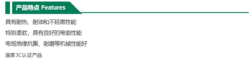 ·具有耐热、耐油和不延燃性能 ·特别柔软,具有良好的弯曲性能 ·电缆绝缘抗撕、耐磨等机械性能好