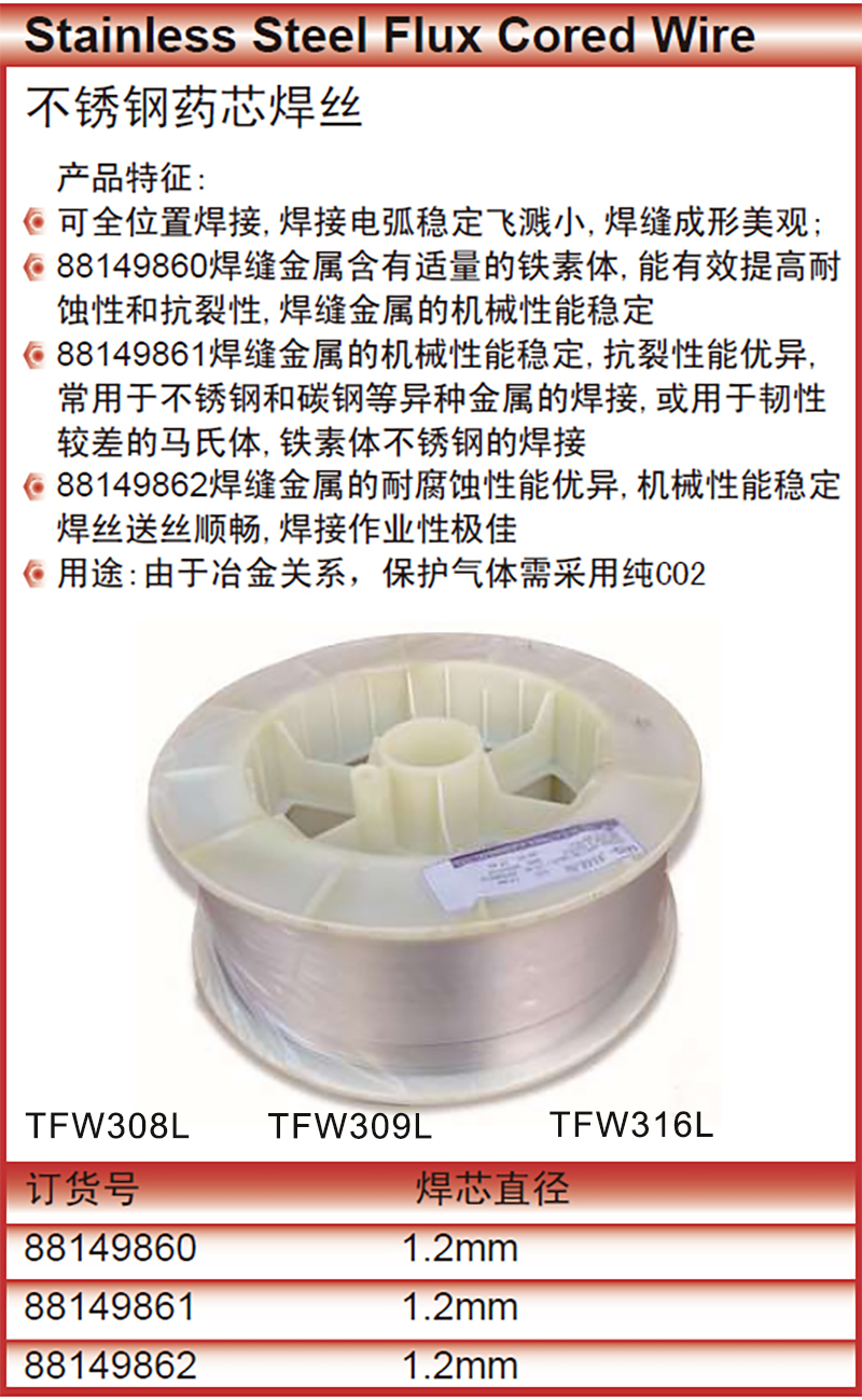规格:  直径Φ1.2mm;牌号 TFW308L 制造商型号:  88149860