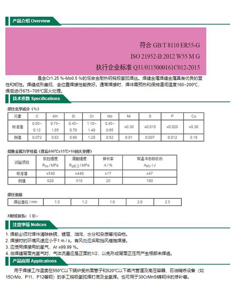·焊缝金属焊缝金属具有优良的塑性和韧性。焊缝成形美观,全位置焊接性能良好