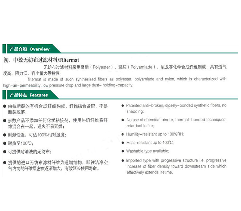 ·初效空气过滤棉主要过滤大于5um的尘埃粒子,采用性能好,强度高,抗断裂的PET有机合成纤维,逐级加密,递增结构,梳理铺网热风制作而成