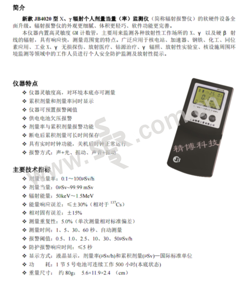 ·仪器灵敏度高,对环境本底亦可测量· 累积剂量和剂量率同时显示· 仪器可预置报警阈值· 供电电池欠压报警· 剂量率与累积剂量报警功能· 断电后累积剂量可长时间保存· 具有实时时钟功能,关机后时钟正常运行· 报警方式:声+光、振动、声音+振动