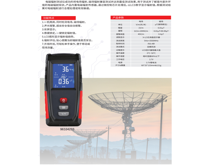 ·—机两用,同时检测电场、磁场辐射。 ·声光报警,超出安全值自动报警。 ·彩屏显示。 ·数据锁定,一键锁定辐射值。 ·LCD图形显示辐射值趋势。 ·辐射评估,贴心提醒当前辐射值是否安全。 ·外观时尚,可轻松单手操作,便于移动或现场测量。