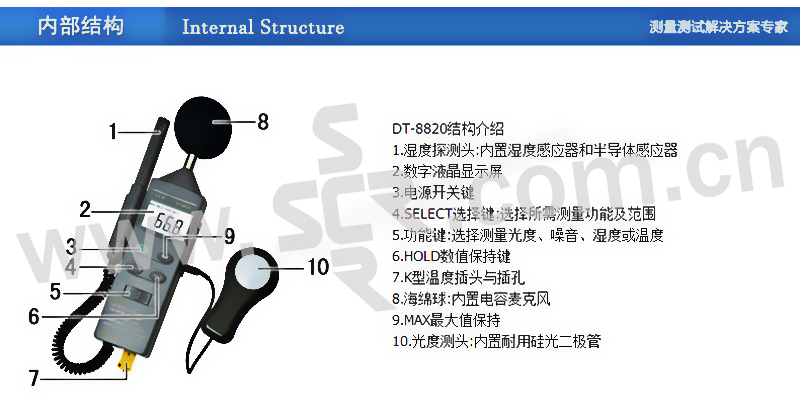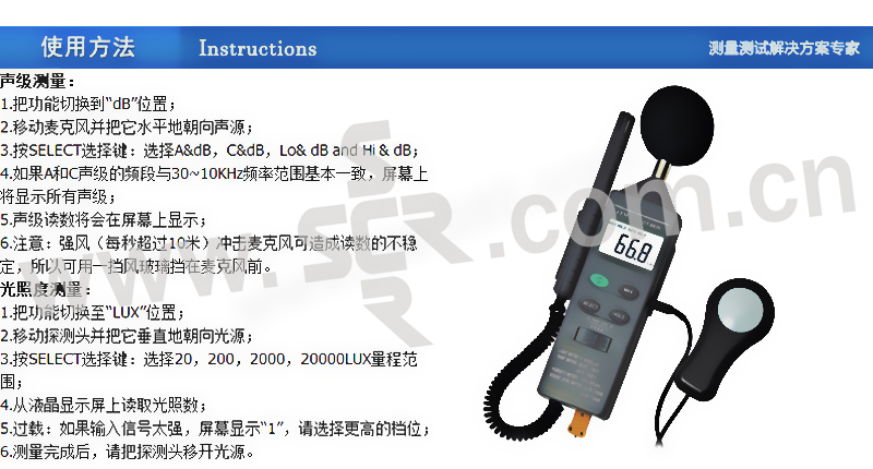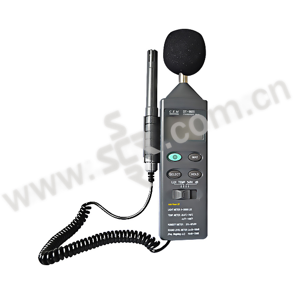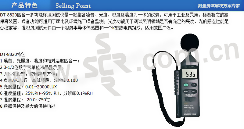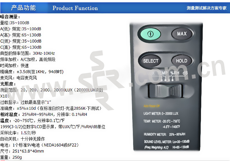 ·噪音、光照度、温度和相对湿度四合一·31/2位数字带单位液晶显示屏·人性化设置,使用简单方便·噪音A/C加权,高低频段,分辨率0.1dB·光度量程:0.01~20000Lux·湿度量程:25%RH~95% RH,分辨率0.1%RH·温度量程:-20.0~750℃·数据保持及最大值保持功能