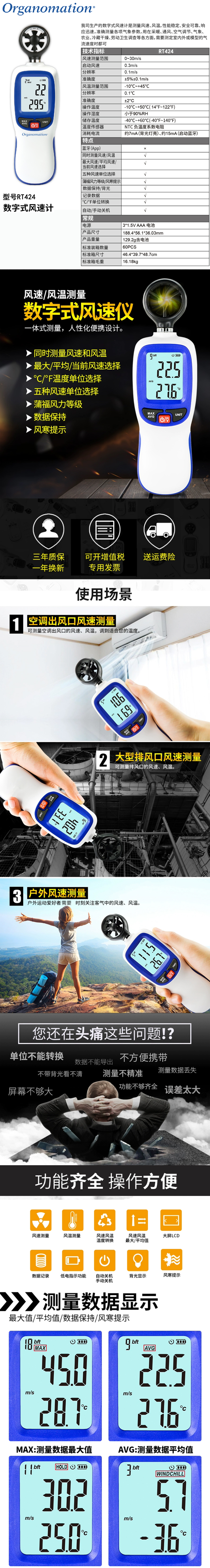 ·同时测量风速和风温 ·最大风速/平均风速/当前风速选择 ·℃ 温度单位选择 ·五种风速单位选择:m/s, Km/h, ft/min, Knots, mph ·蒲福风力等级 ·数据保持 ·LCD背光显示 ·手动自动关机 ·风寒提示 ·低电提示 ·蓝牙功能(仅WT82B) ·记录999组数据