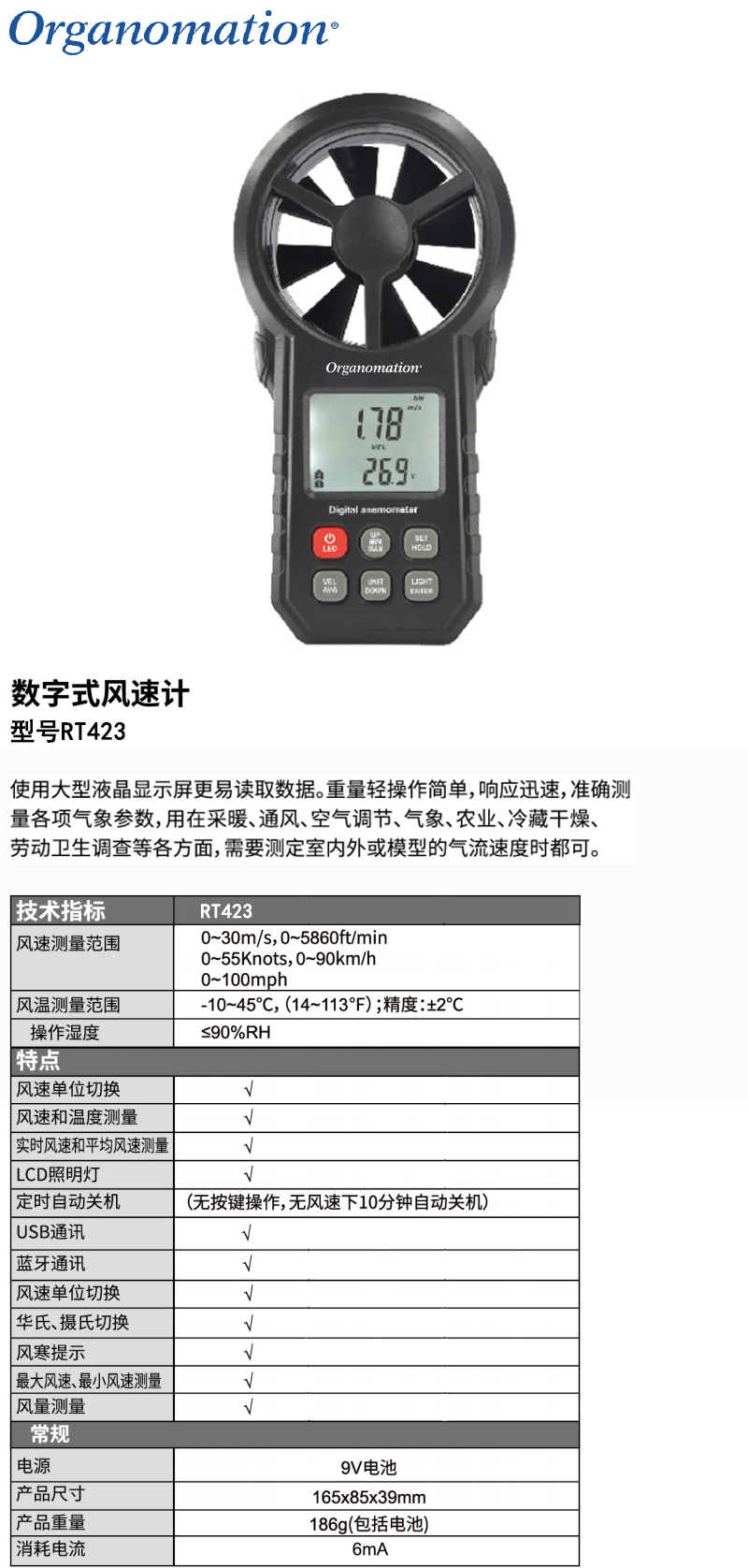 ·风速和温度测量 ·风寒提示 · 风速单位切换 ·实时风速和平均风速测量 ·最大风速、最小风速测量 ·华氏、摄氏单位切换 ·定时自动关机(无按键操作,10分钟自动关机) ·LED照明灯 ·风量测量 ·usb通讯(配合电脑应用程序) 11).蓝牙通讯(配合手机APP)
