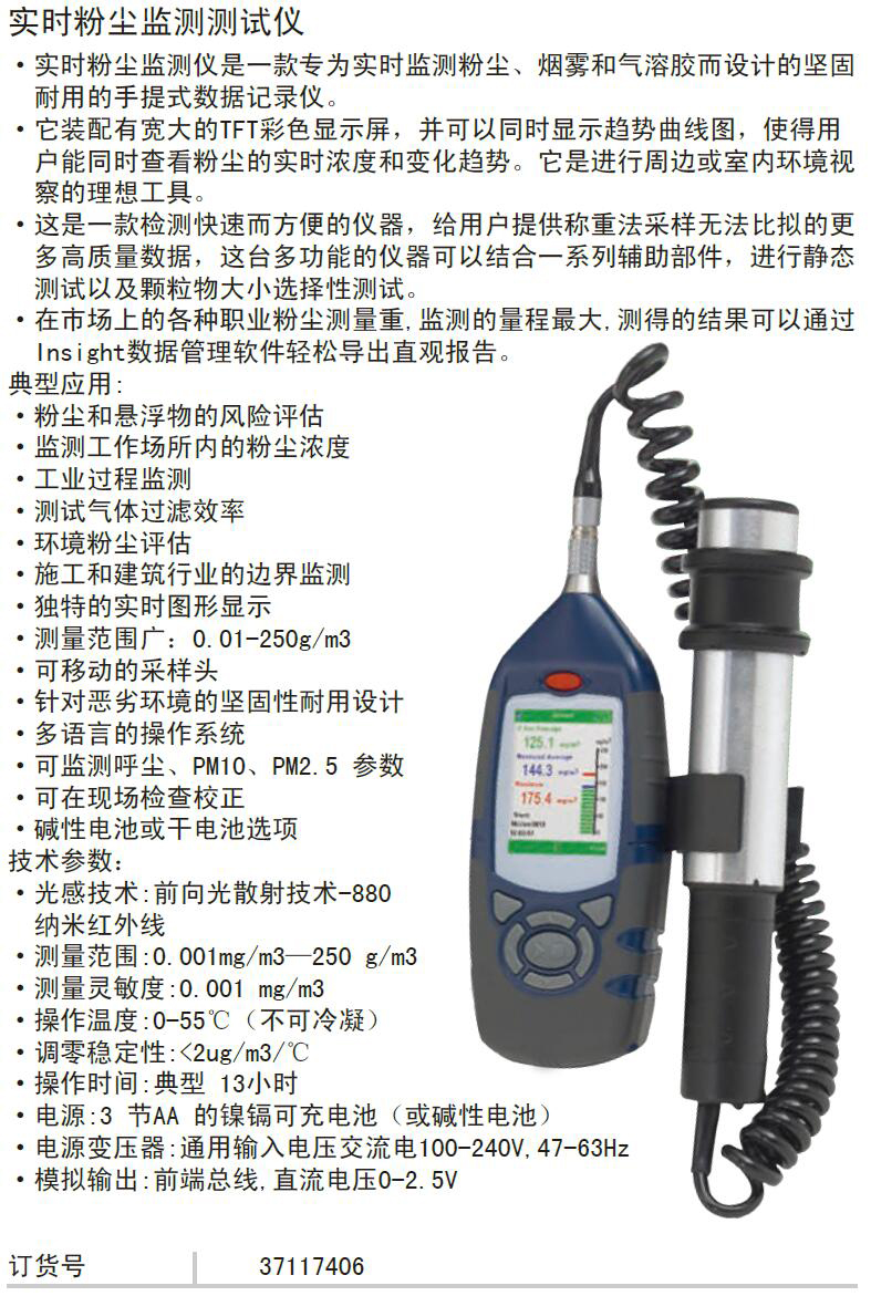 ·实时粉尘监测仪是一款专为实时监测粉尘、烟雾和气溶胶而设计的坚固 耐用的手提式数据记录仪。 ·它装配有宽大的TFT彩色显示屏,并可以同时显示趋势曲线图,使得用 户能同时查看粉尘的实时浓度和变化趋势。 ·它是进行周边或室内环境视察的理想工具。 ·这是一款检测快速而方便的仪器,给用户提供称重法采样无法比拟的更多高质量数据,这台多功能的仪器可以结合一系列辅助部件,进行静态测试以及颗粒物大小选择性测试。 ·在市场上的各种职业粉尘测量重,监测的量程最大,测得的结果可以通过Insight数据管理软件轻松导出直观报告。