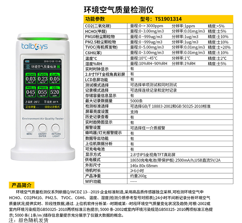 `采用高品质传感器独立采样,可检测环境空气中HCHO、CO2PM10、PM2.5、TVOC、C6H6、温度、湿度(检测介质参考型号对照表)