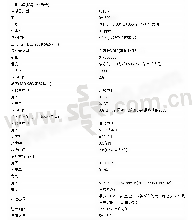 ·同时测量二氧化碳、一氧化碳、温度和湿度·计算露点、湿球温度和室外空气百分比·大屏幕显示·最多可同时显示五个参数·屏幕可显示信息和说明·支持12种不同语言,包含中文界面·数据存储39天(储存间隔一分钟)·蓝牙通讯传输数据或远传