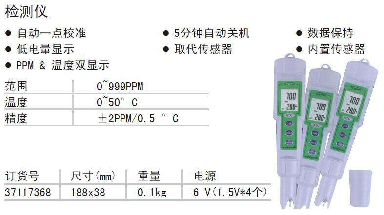 · 自动一点校准 · 5分钟自动关机 · 数据保持 · 低电量显示 · 取代传感器 · 内置传感器 · PPM & 温度双显示