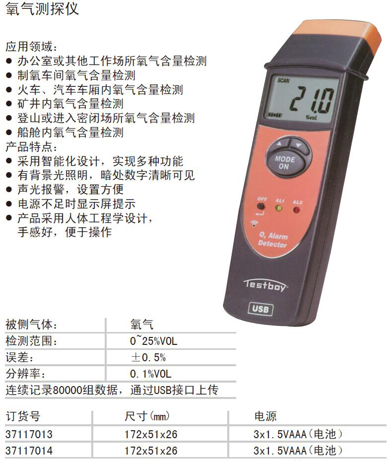 A51450 37117013 0~25%VOL 3x1.5VAAA(电池) 氧气 172×51×26mm 连续记录80000组数据,通过USB接口上传 ±0.5% 4425.00