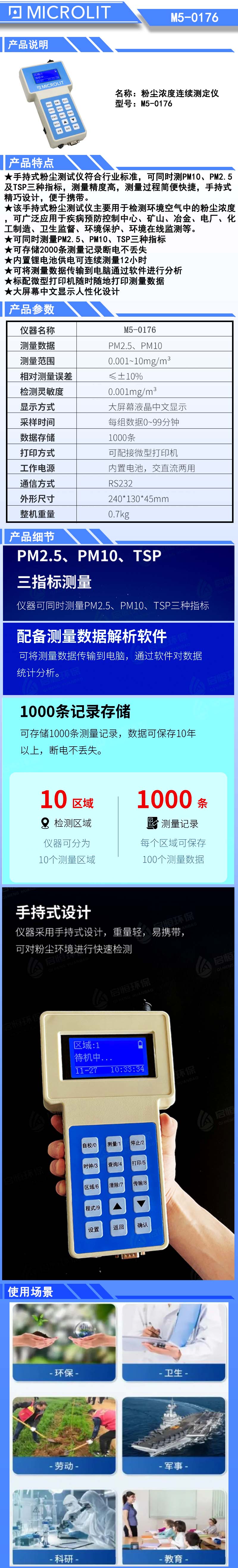 *可同时测量PM2.5、PM10、TSP三种指标 *可存储2000条测量记录断电不丢失内置锂电池供电可连续测量12小时 *可将测量数据传输到电脑通过软件进行分析标配微型打印机随时随地打印测量数据 *大屏幕中文显示人性化设计