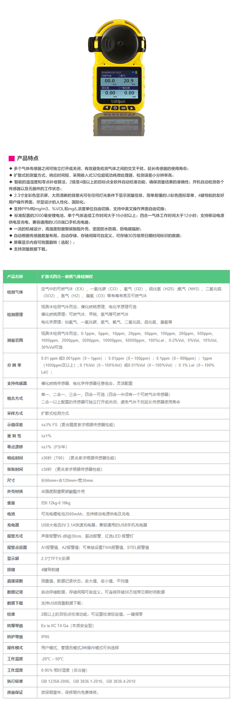 H63305 TS211411 EX CO H2S O2 ≤3%FS 扩散式 移动电源,USB手机充电器 扩散式气体检测仪 4858.00