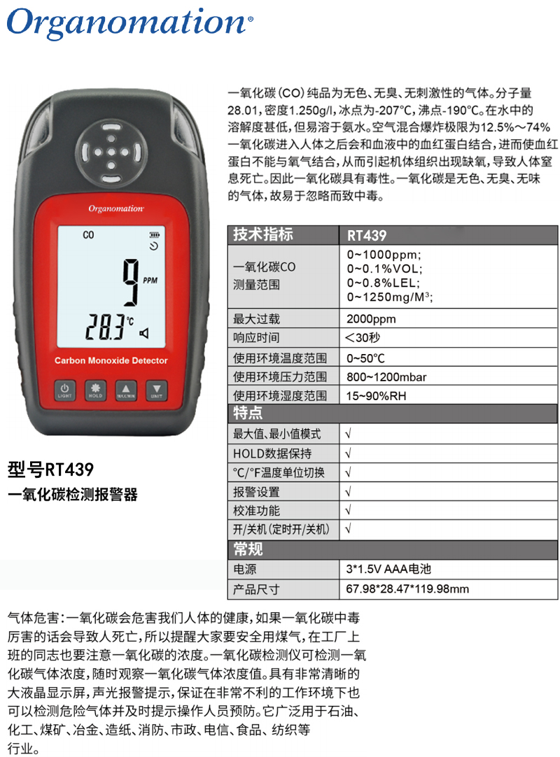 LX10527 RT439 一氧化碳测量范围:0~1000PPM、0~0.1%VOL、0~0.8%LEL、0~1250mg/M3 3×1.5V AAA电池 产品尺寸:67.98×28.47×119.98mm 532.00