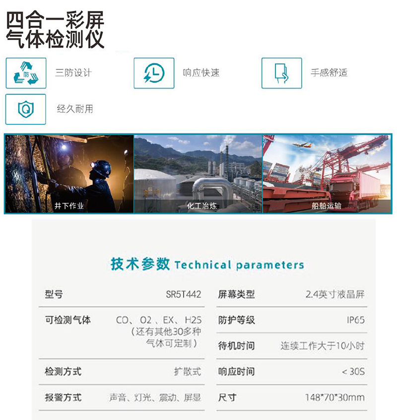D33221 SR5T442 CO O2/0~30%vol EX/0~100%LEL H25 H₂S SO₂ <30s 扩散式 3.7V可充电锂电池 140x70x30mm 2470.00