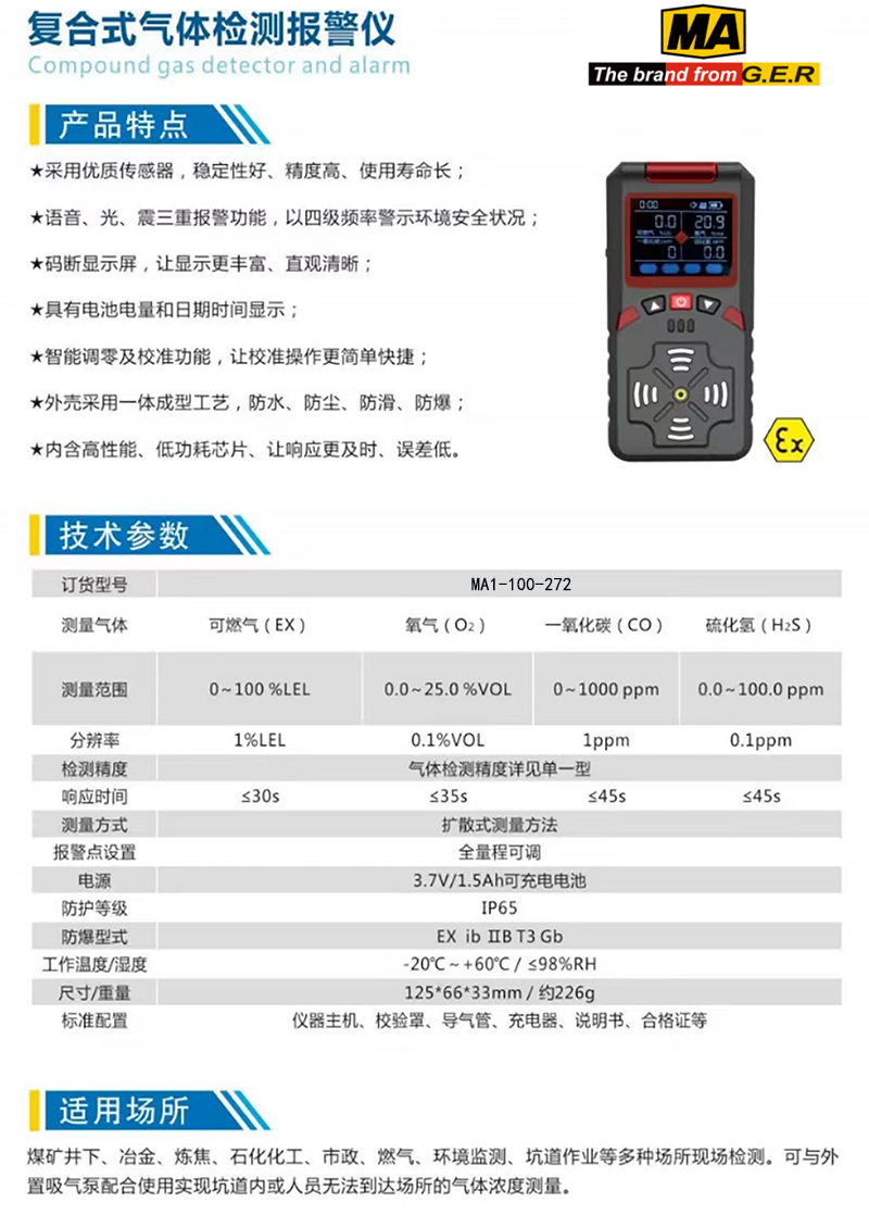 E14742 MA1-100-272 可燃气 氧气 一氧化碳(CO) 硫化氢 测量范围 响应时间 报警点设置 电源 防护等级 4200.00