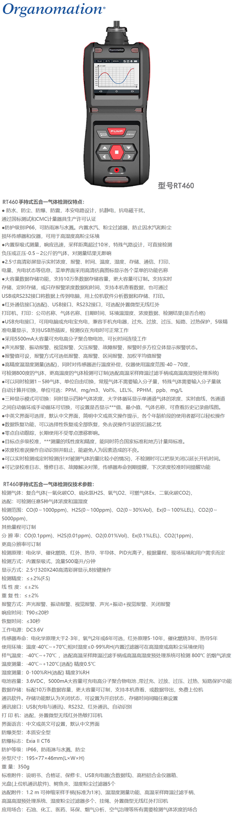 ·可以同时检测1~ 5种气体,单位自由切换。 单位可选:PPM、mg/m3、Vol%、LEL%、PPHM、ppb、mg/L. ·内置泵吸式测量,集成水汽、粉金过津器,防止因水汽和粉金损坏传略到和仪器,可用 于高湿度、高粉全环境,响应迅速,特殊气路设计,采样距声大于10 米,可直接检测负压或正压-0.5~2公斤的气体 ·丰富的人机界面。 2.5 寸高清彩屏,显示实时浓度、报警、时间、温度、湿度、存储等信息菜单界面采用高清侦真图形显示各个英单的功能名称 ·大容量数据存愉功能(客量可定制》,支持多种存储方式 标