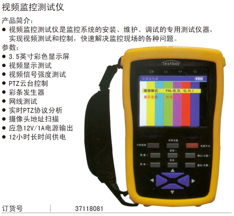 · 视频监控测试仪是监控系统的安装、维护、调试的专用测试仪器, 实现视频测试和控制,快速解决监控现场的各种问题。 参数: · 3.5英寸彩色显示屏 · 视频显示测试 · 视频信号强度测试 · PTZ云台控制 · 彩条发生器 · 网线测试 · 实时PTZ协议分析 · 摄像头地址扫描 · 应急12V/1A电源输出 · 12小时长时间供电