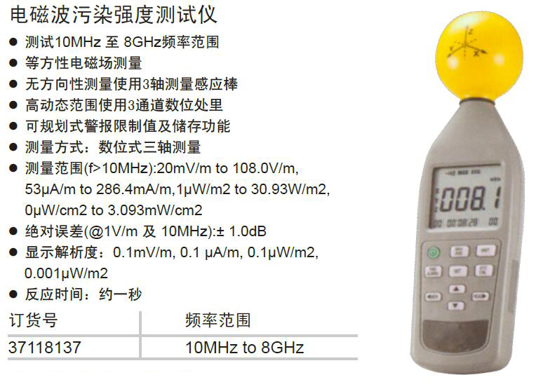 ·测试10MHz 至 8GHz频率范围 · 等方性电磁场测量 · 无方向性测量使用3轴测量感应棒 · 高动态范围使用3通道数位处里 · 可规划式警报限制值及储存功能 · 测量方式:数位式三轴测量