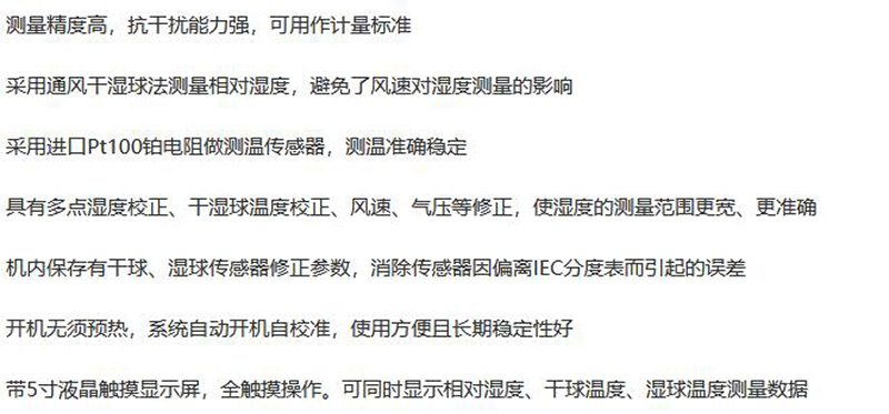 ·测量精度高,抗干扰能力强,可用作计量标准。 ·采用通风干湿球法测量相对湿度,避免了风速对湿度测量的影响。 ·采用进口pt100铂电阻做测温传感器,测温准确稳定。 ·具有多点湿度校正、干湿球温度校正、风速气压等修正,使湿度的测量范围更宽更准确。 ·机内保存有干球湿球传感器修正参数,消除传感器因偏离IEC分度表而引起的误差。 ·开机无需预热,系统自动开机自校准,使用方便且长期稳定。
