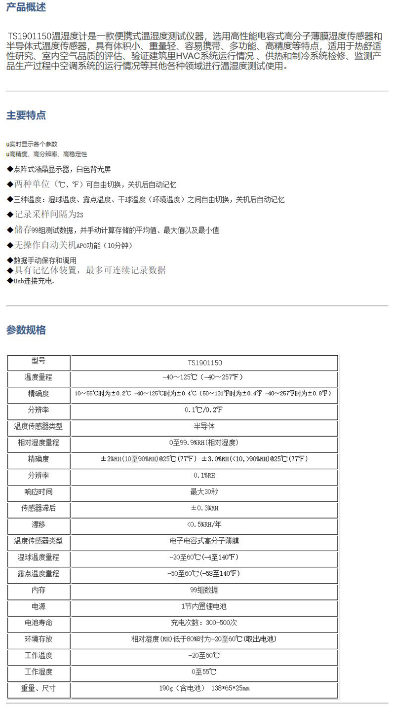 ·一款便携式温湿度测试仪器,选用高性能电容式高分子薄膜湿度传感器和半导体式温度传感器,具有体积小、重量轻、容易携带、多功能、高精度等特点