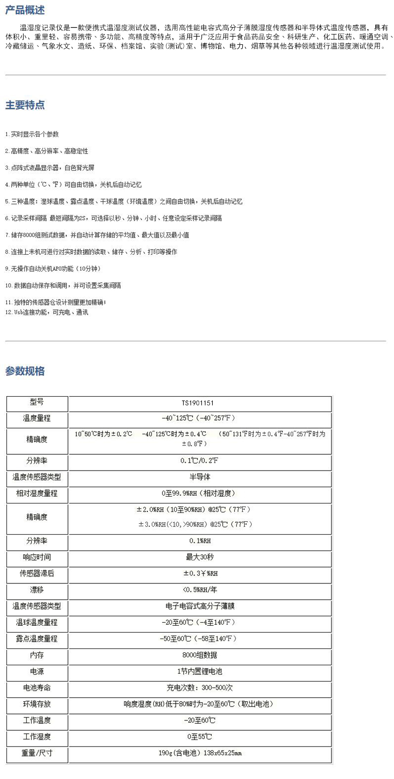 H10050 TS1901151 -40~125℃ 0.1℃ -40~257℉ 0.2℉ 7006.00