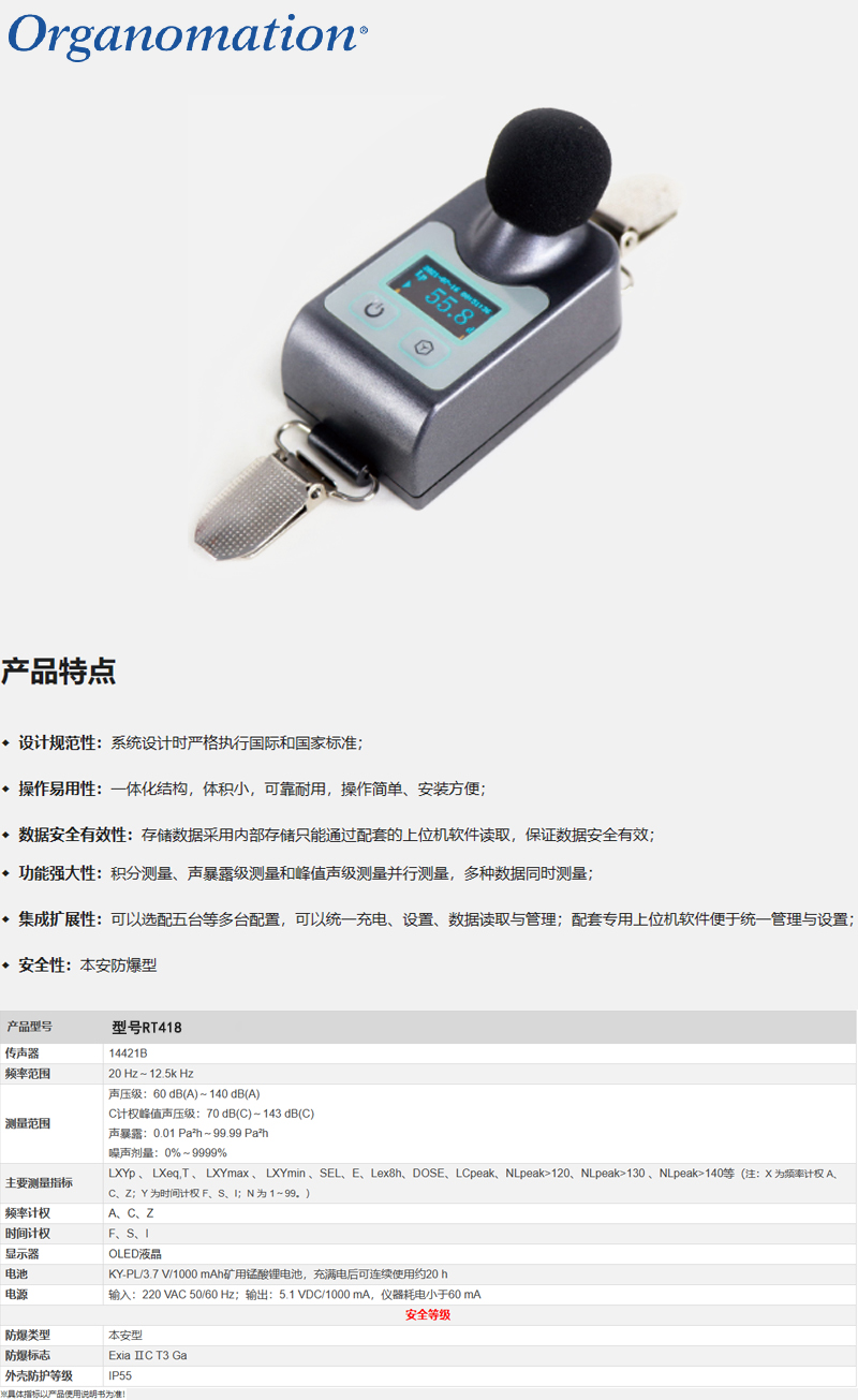 ·符号个人声暴露计和2级声级标准 ·安全性能符合GB/T3836.1—2021、GB/T3836.4—2021的有关规定 ·具有多功能、高性能、体积小、耗电等优点 ·积分测量、声暴露级测量和峰值声级测量并行(同时)进行 ·具有按键锁定功能,防止使用者误操作 ·具有脉冲声超过峰值的次数统计功能 ·外壳防护等级:IP 55 ·已取得本安型防爆证书