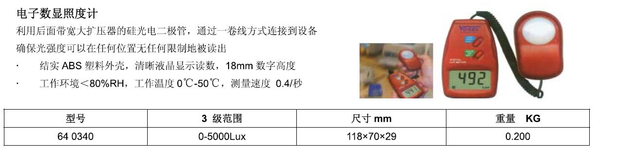 ·利用后面带宽大扩压器的硅光电二极管. ·通过一卷线方式连接到设备确保光强度可以在任何位置无任何限制地被读出结实 ABS 塑料外壳. ·清晰液晶显示读数. ·18mm 数字高度工作环境< 80%RH. ·工作温度0℃—50℃ . ·测量速度 0.4/秒