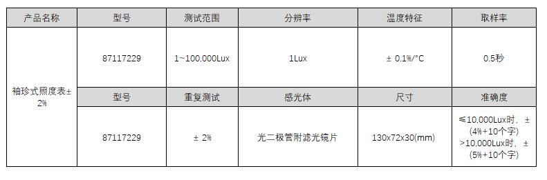 A39438 87117229 1~100,000Lux 1Lux ≤10,000Lux时,± (4%+10个字) >10,000Lux时,± (5%+10个字) 0.5秒 光二极管附滤光镜片 ± 0.1%/°C ± 2% 130×72×30(mm) 381.00