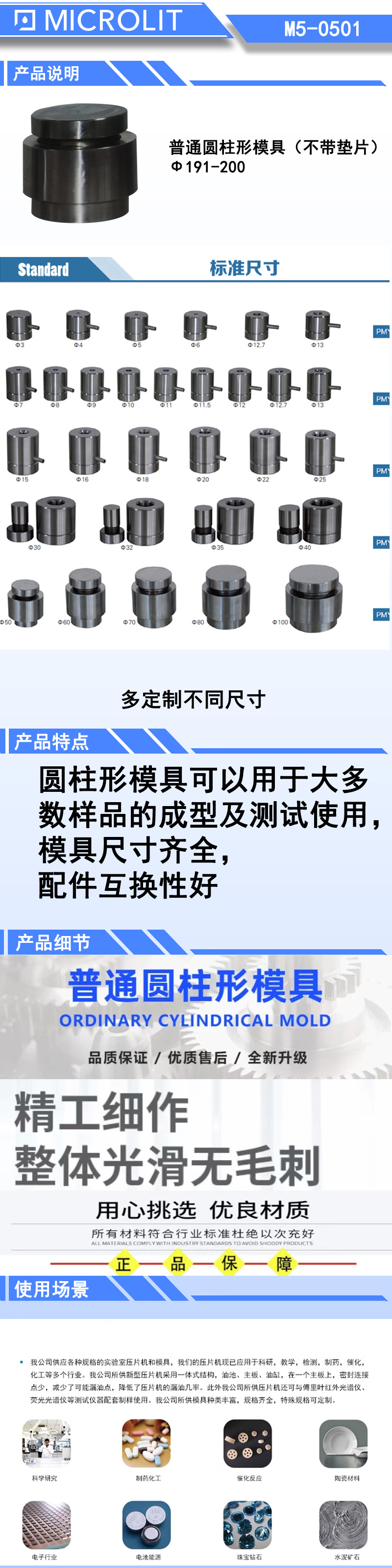 *圆柱形模具可以用于大多数样品的成型机测试使用,模具尺寸齐全,配件互换性好
