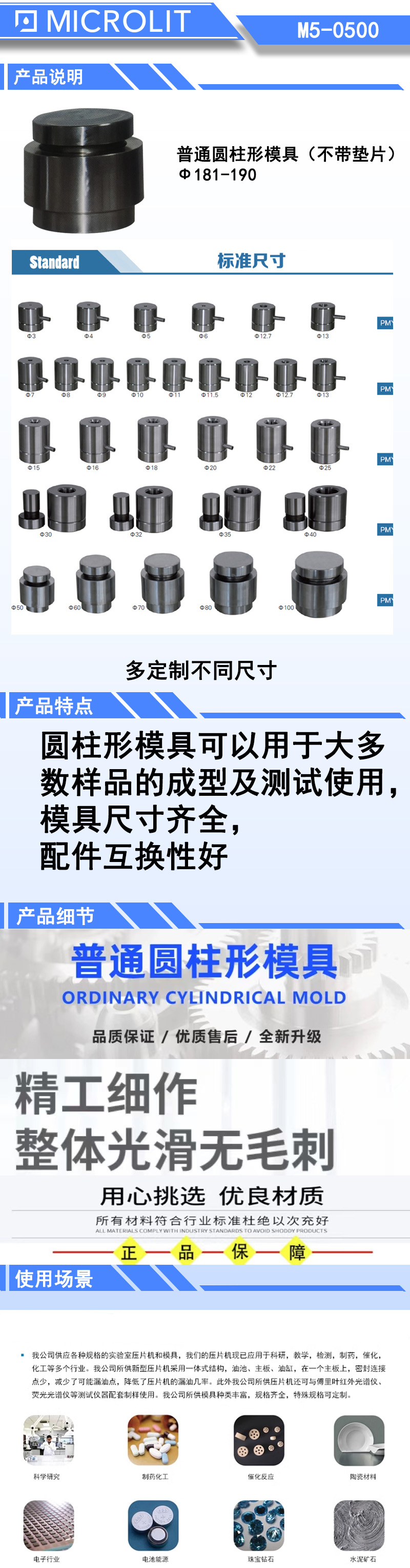 *圆柱形模具可以用于大多数样品的成型机测试使用,模具尺寸齐全,配件互换性好