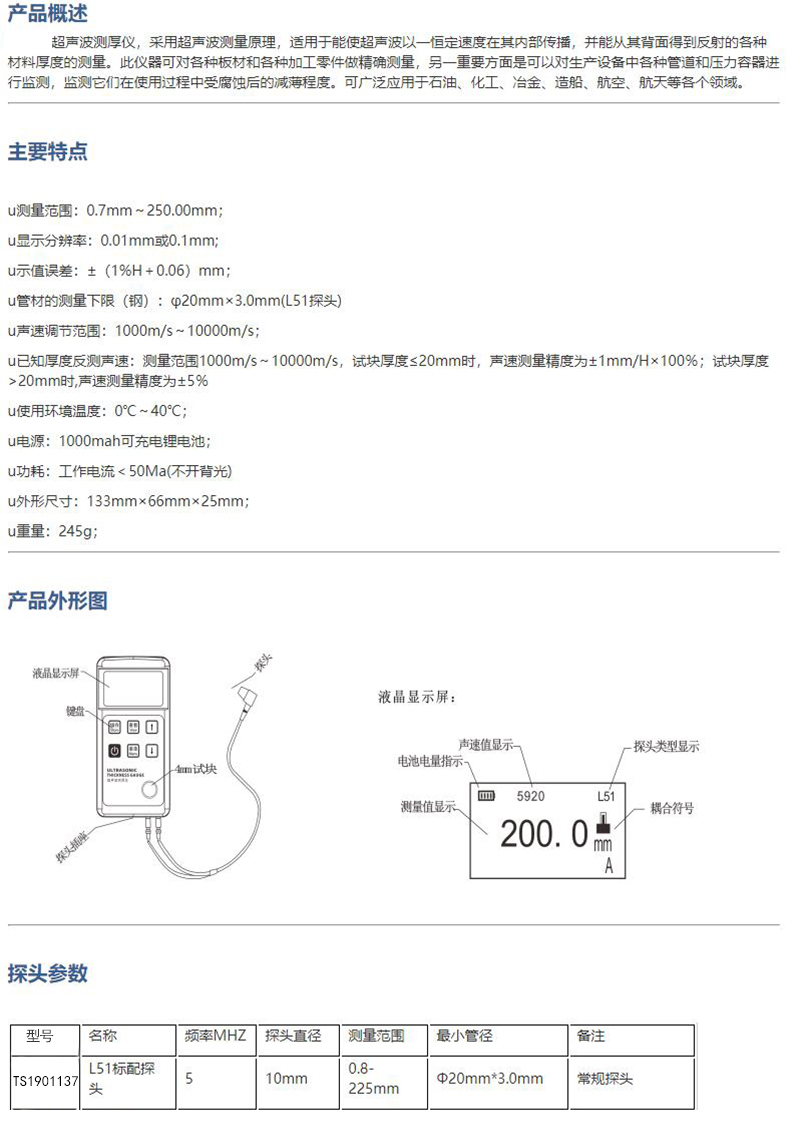 ·采用超声波测量原理,适用于能使超声波以一恒定速度在其内部传播,并能从其背面得到反射的各种材料厚度的测量