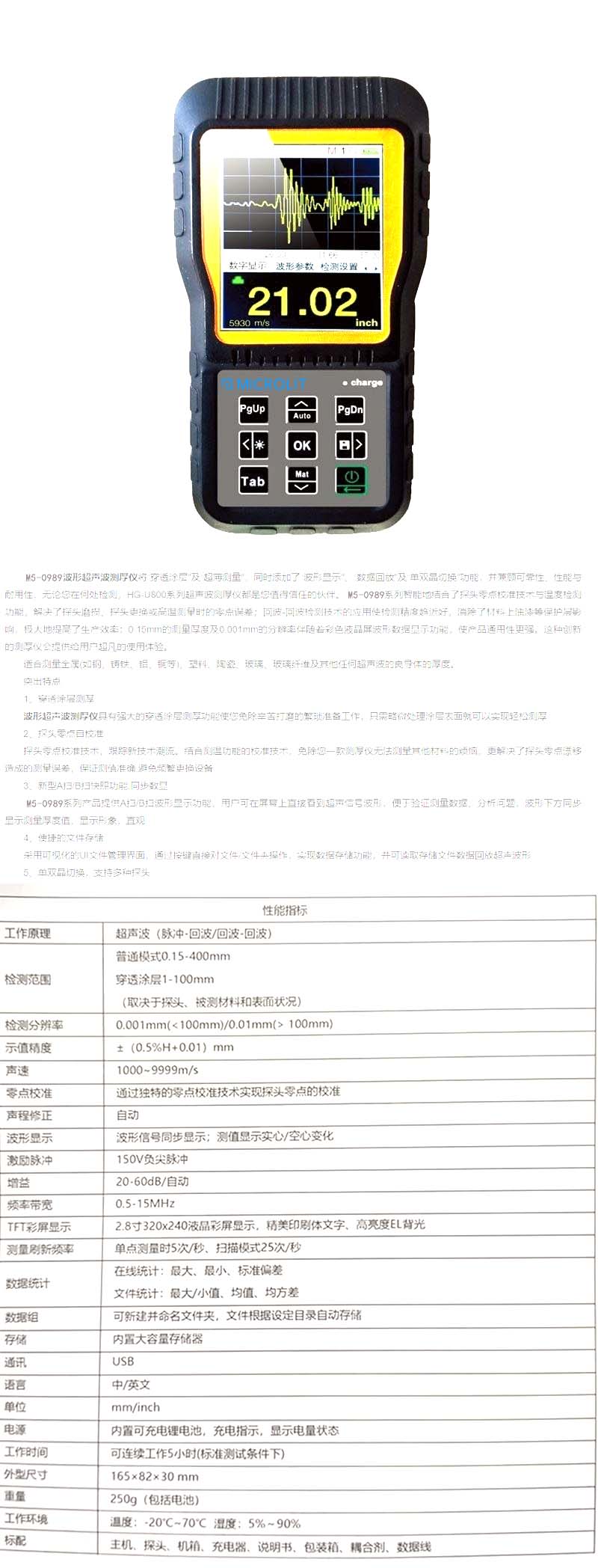 *强大的穿透涂层测厚功能使您免除辛苦打磨的繁琐准备工作,只需略微处理涂层表面就可以实现轻松测厚 *先进的探头零点校准技术,跟踪世界最新技术潮流。结合测温功能的校准技术,免除您一款测厚仪无法测量其他材料的烦恼,更解决了探头零点漂移造成的测量误差,保证测值准确,避免频繁更换设备 *HG-U800系列产品提供A扫/B扫波形显示功能,用户可在屏幕上直接看到超声信号波形,便于验证测量数据、分析问题,波形下方同步显示测量厚度值,显示形象,直观 *采用可视化的U文件管理界面,通过按键直接对文件/文件夹操作,实现数据存储功能,并可读取存储文件数据回放超声波形 *单双晶功能切换可分别实现对超薄零件及较厚零件的测量,并具有0.001mm的分辨能力,支持多种探头,可应用各种场景 *可以测量1mm一下超薄件,最薄可测0.15mm
