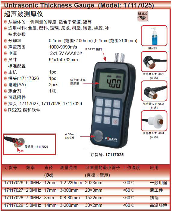·背光的液晶显示器 ·4.00mm块校准 ·适用材料:金属,塑料,玻璃,尼龙,树脂,陶瓷,橡胶,冰 ·标准配置:主机 1pc;探头r 17117026 1pc;电池(AA) 2pcs;耦合剂 1瓶 ·可选附件:探头: 17117027, 17117028, 17117029;RS232 缆和软件