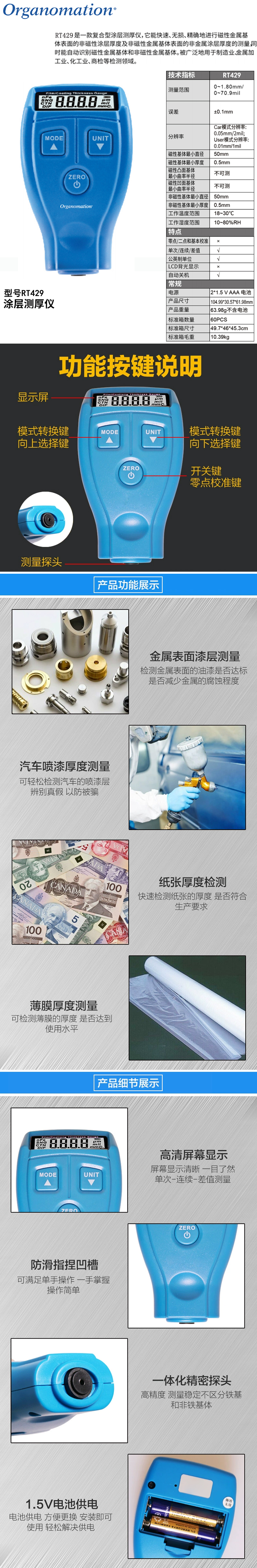 ·金属基底表面涂层厚度测量, ·具有Car/User 两种模式。 ·具有单次,连续,差值三种测量方式。 ·具有零点,二点,基本三种校准功能。 ·公英制单位选择。 ·自动关机功能。