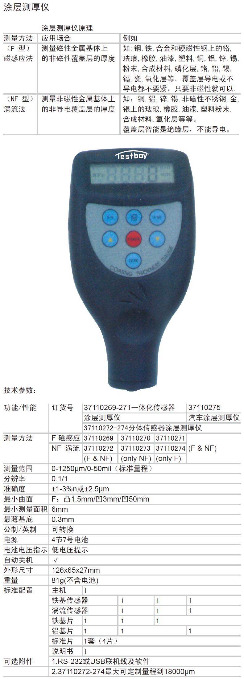 ·测量方法 应用场合 例如(F 型) 测量磁性金属基体上 如:钢,铁,合金和硬磁性钢上的铬,磁感应法 的非磁性覆盖层的厚度 珐琅,橡胶,油漆,塑料,铜,铝,锌,锡,粉末,合成材料,磷化层,铬,铅,锡,镉,瓷,氧化层等。覆盖层导电或不导电都不要紧,只要非磁性就可以。 ·(NF 型) 测量非磁性金属基体上 如:铜,铝,锌,锡,非磁性不锈钢,金,涡流法 的非导电覆盖层的厚度 银上的珐琅,橡胶,油漆,塑料粉末,合成材料,氧化层等等。覆盖层智能是绝缘层,不能导电。