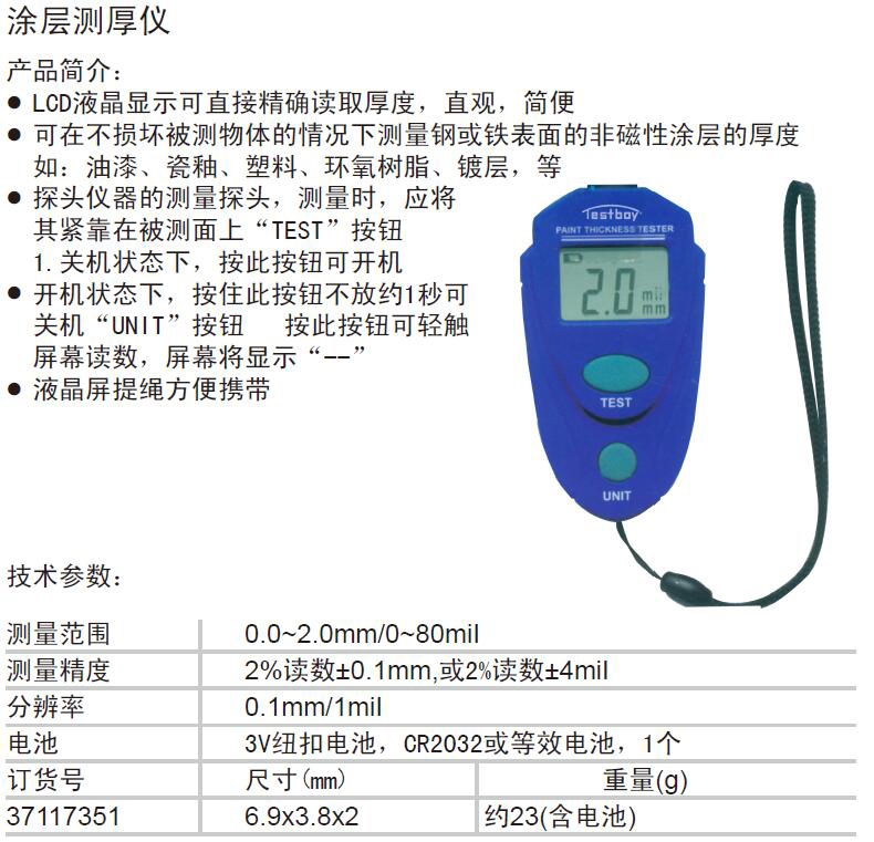 ·LCD液晶显示可直接精确读取厚度,直观,简便 ·可在不损坏被测物体的情况下测量钢或铁表面的非磁性涂层的厚度,如:油漆、瓷釉、塑料、环氧树脂、镀层,等 ·探头仪器的测量探头,测量时,应将其紧靠在被测面上“TEST”按钮 ·关机状态下,按此按钮可开机 ·开机状态下,按住此按钮不放约1秒可 ·关机“UNIT”按钮 按此按钮可轻触,屏幕读数,屏幕将显示“--” ·液晶屏提绳方便携带