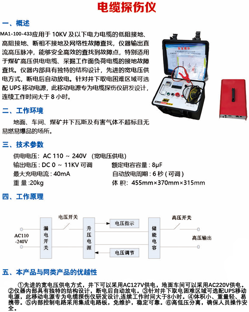 ·先进的宽电压供电方式,全国首创,井下可以采用AC127V供电,地面车间可以采用 AC220V供电。 ·仪器内部具有独特的结构设计,断电后自动放电。 ·针对井下取电困难区域可选配UPS移动电源,此移动电源专为电缆探伤仪研发设计,连续工作时间大于8小时。 ·体积小、重量轻、易携带。 ·内部控制电路采用集成电路板,免维护,稳定可靠。 ·高低压分离,确保人员操作安全。